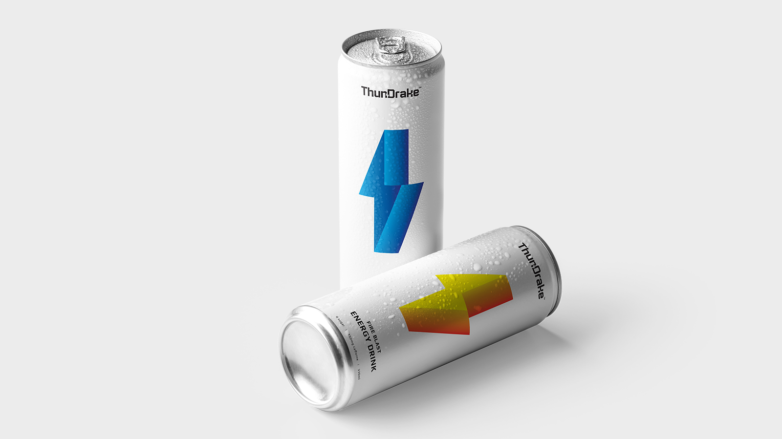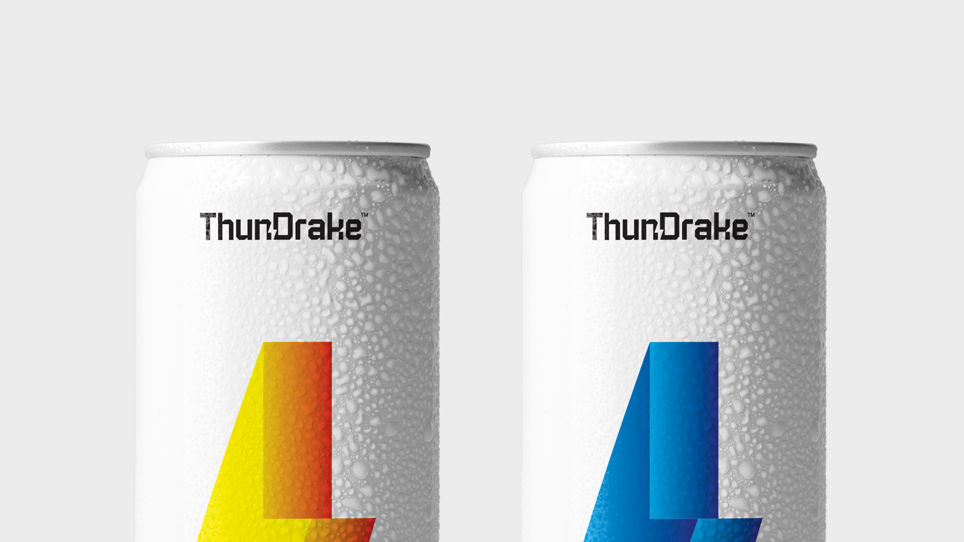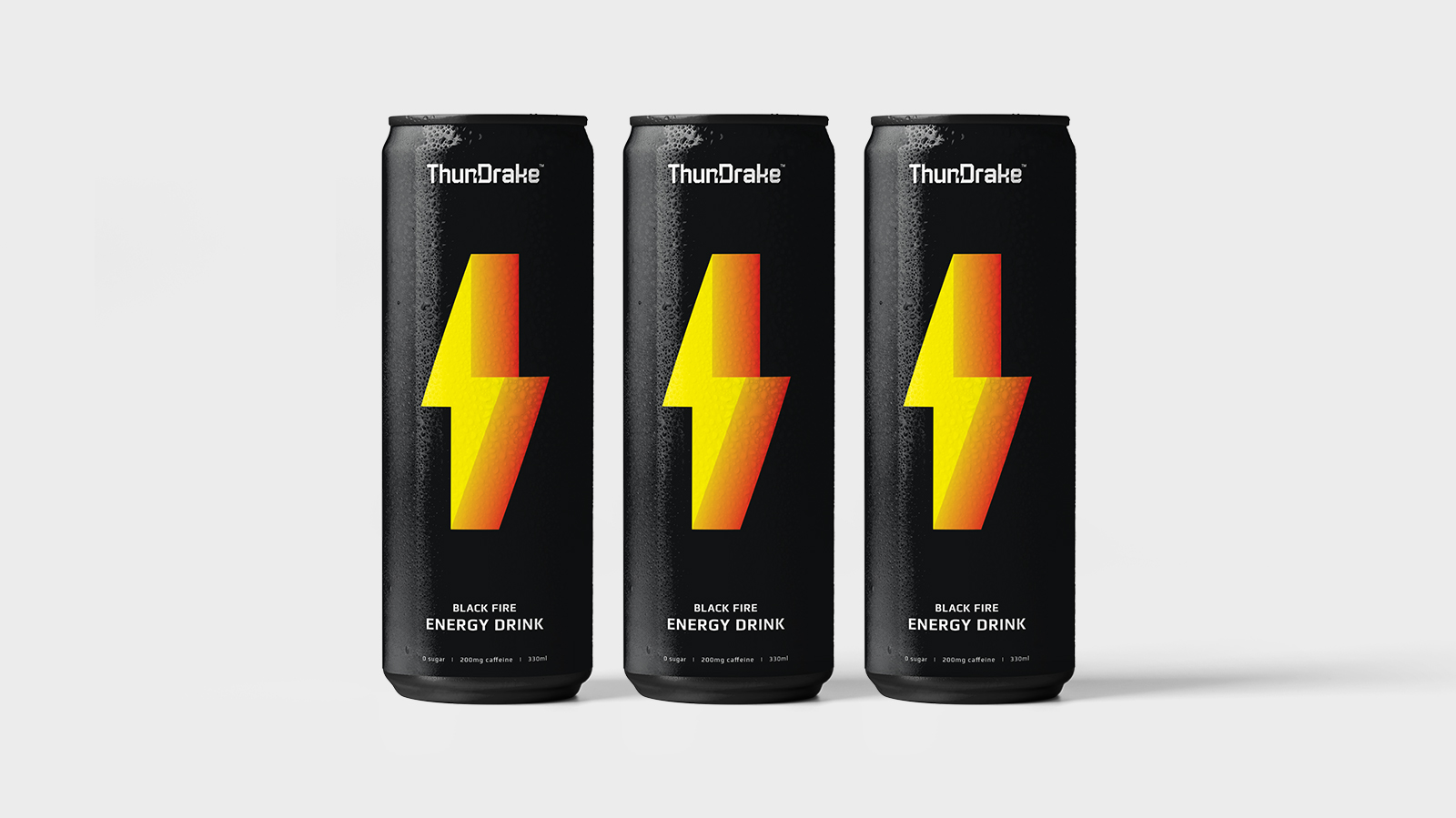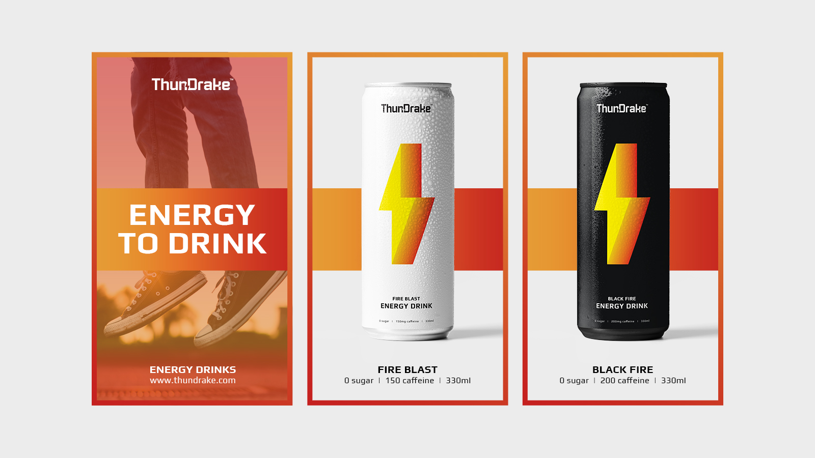 ThunDrake is a low calorie, sugar-free, energy drink. The brand currently has 3 different flavors - Ice Blast, Fire Blast, and Black Fire. Each flavor has a different amount of caffeine. The company is targeting mostly athletics, helping them perform better workouts. The logo is custom made typeface for the name ThunDrake with hidden lightning in the negative space. The labels are combination of minimalistic look and fresh gradient colors.