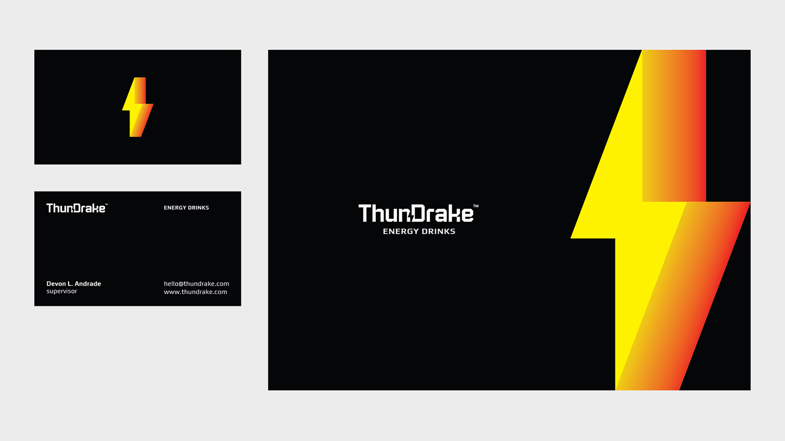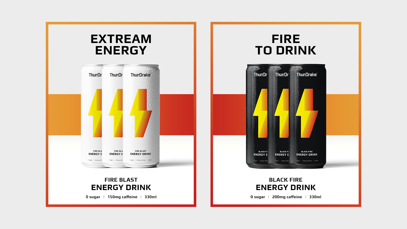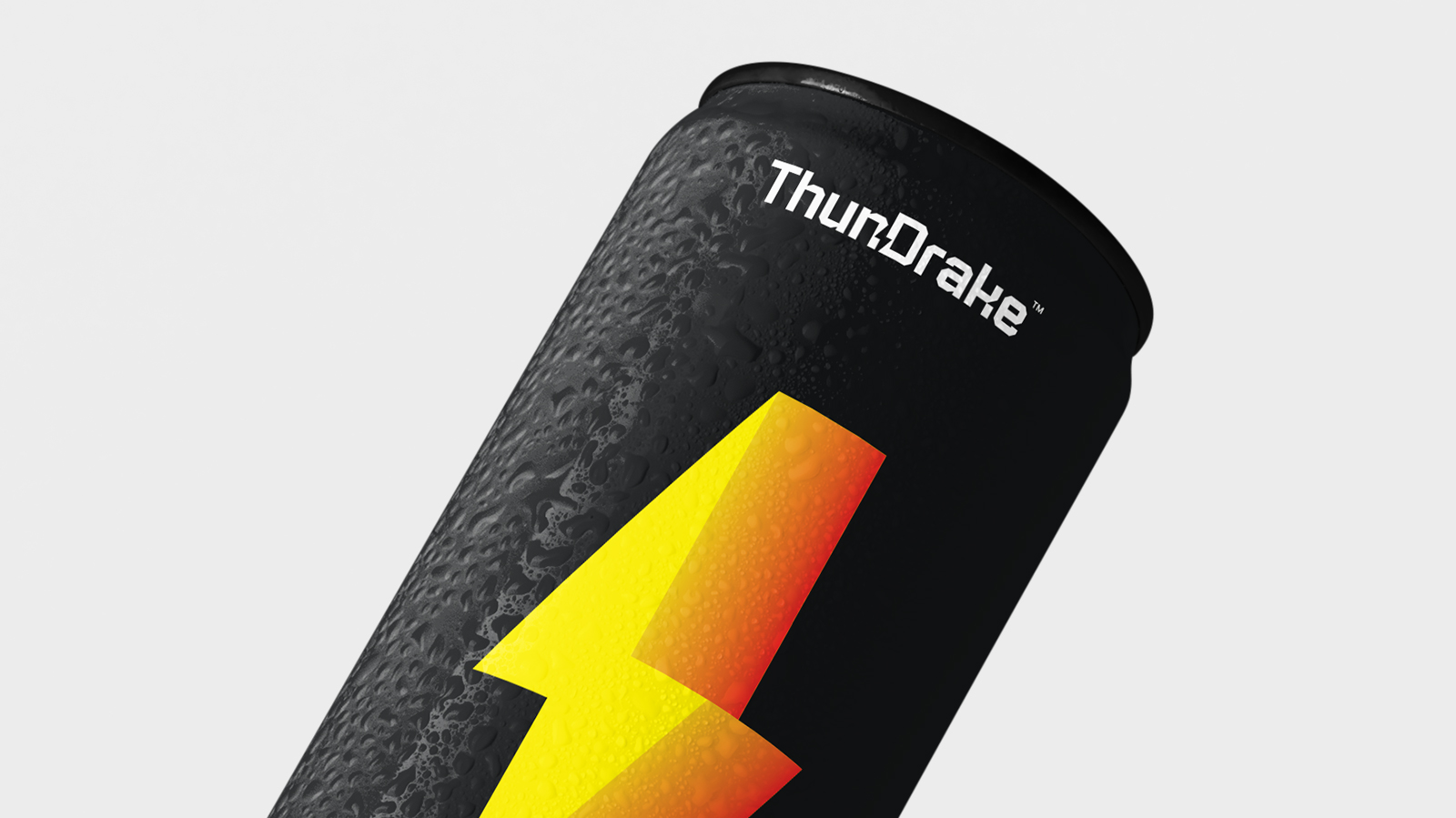 ThunDrake is a low calorie, sugar-free, energy drink. The brand currently has 3 different flavors - Ice Blast, Fire Blast, and Black Fire. Each flavor has a different amount of caffeine. The company is targeting mostly athletics, helping them perform better workouts. The logo is custom made typeface for the name ThunDrake with hidden lightning in the negative space. The labels are combination of minimalistic look and fresh gradient colors.