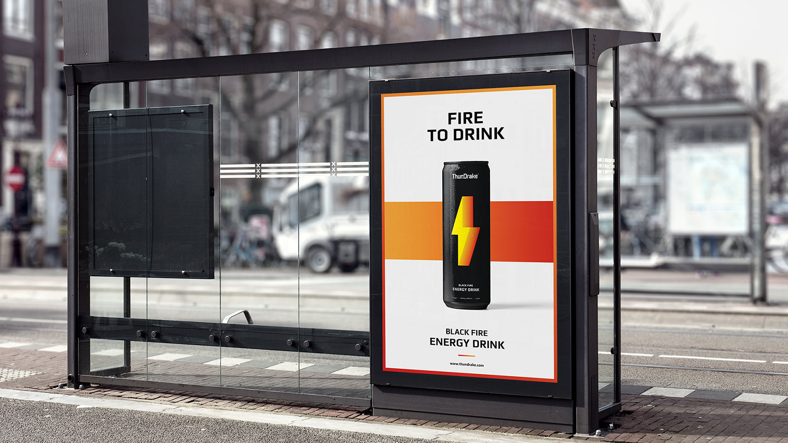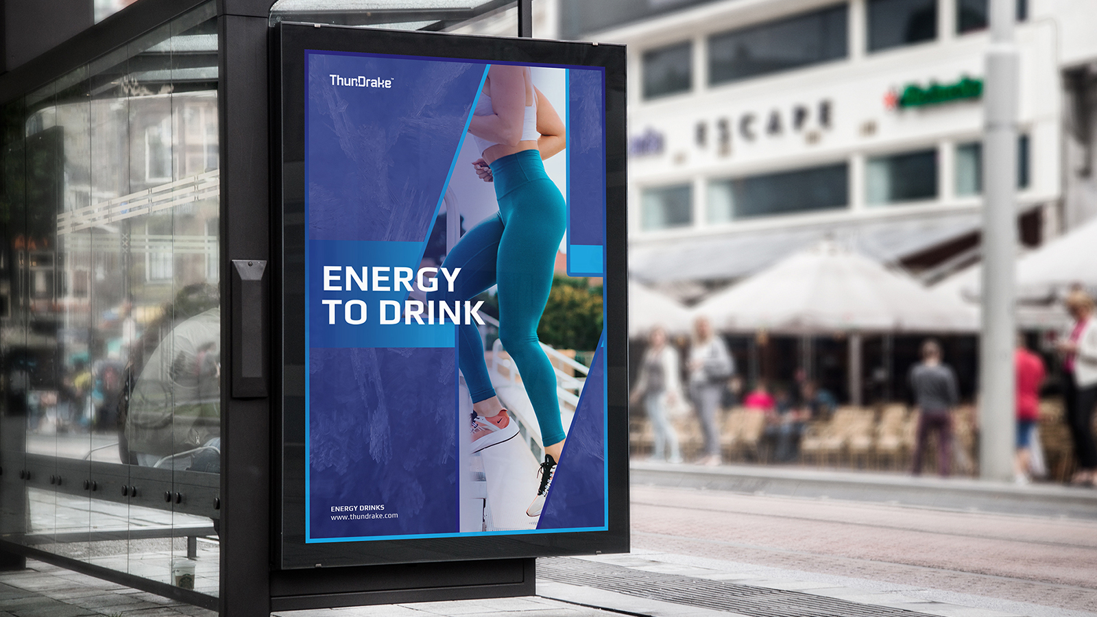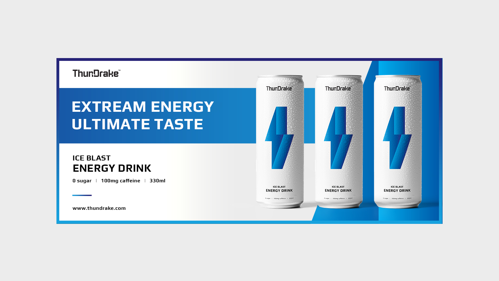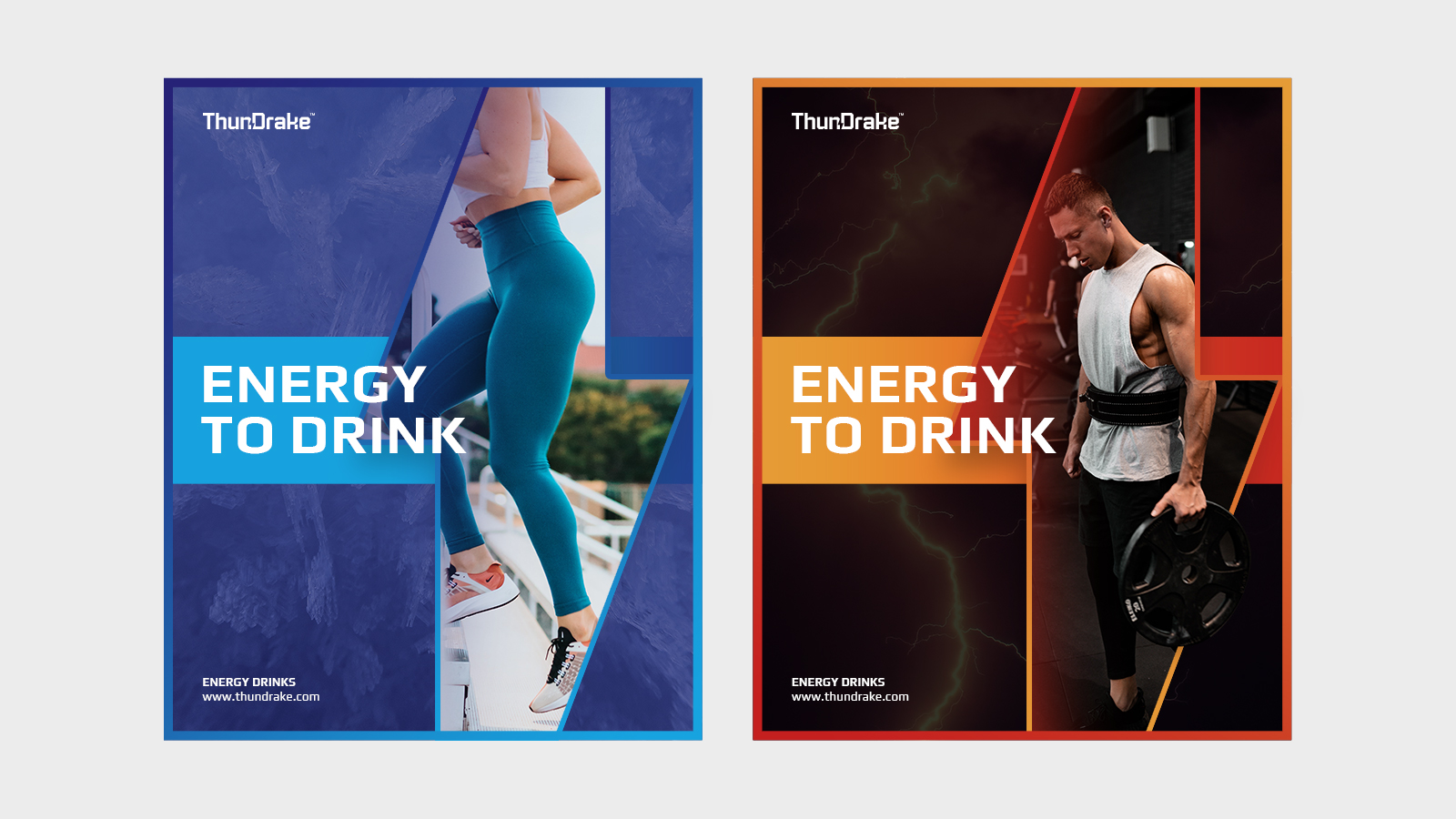 ThunDrake is a low calorie, sugar-free, energy drink. The brand currently has 3 different flavors - Ice Blast, Fire Blast, and Black Fire. Each flavor has a different amount of caffeine. The company is targeting mostly athletics, helping them perform better workouts. The logo is custom made typeface for the name ThunDrake with hidden lightning in the negative space. The labels are combination of minimalistic look and fresh gradient colors.